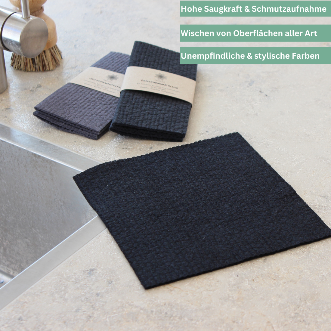 Unsere kompostierbaren Öko-Schwammtücher aus 100% nachwachsenden Rohstoffen in schwarz und anthrazit sind schnelltrocknend und bilden damit Bakterien und Keime keinen Raum zu wachsen. Du kannst die Schwammtücher unzählige Male in der Wasch- und Spülmaschine (bis 90°C) waschen und hast damit ein sehr langlebiges Produkt.