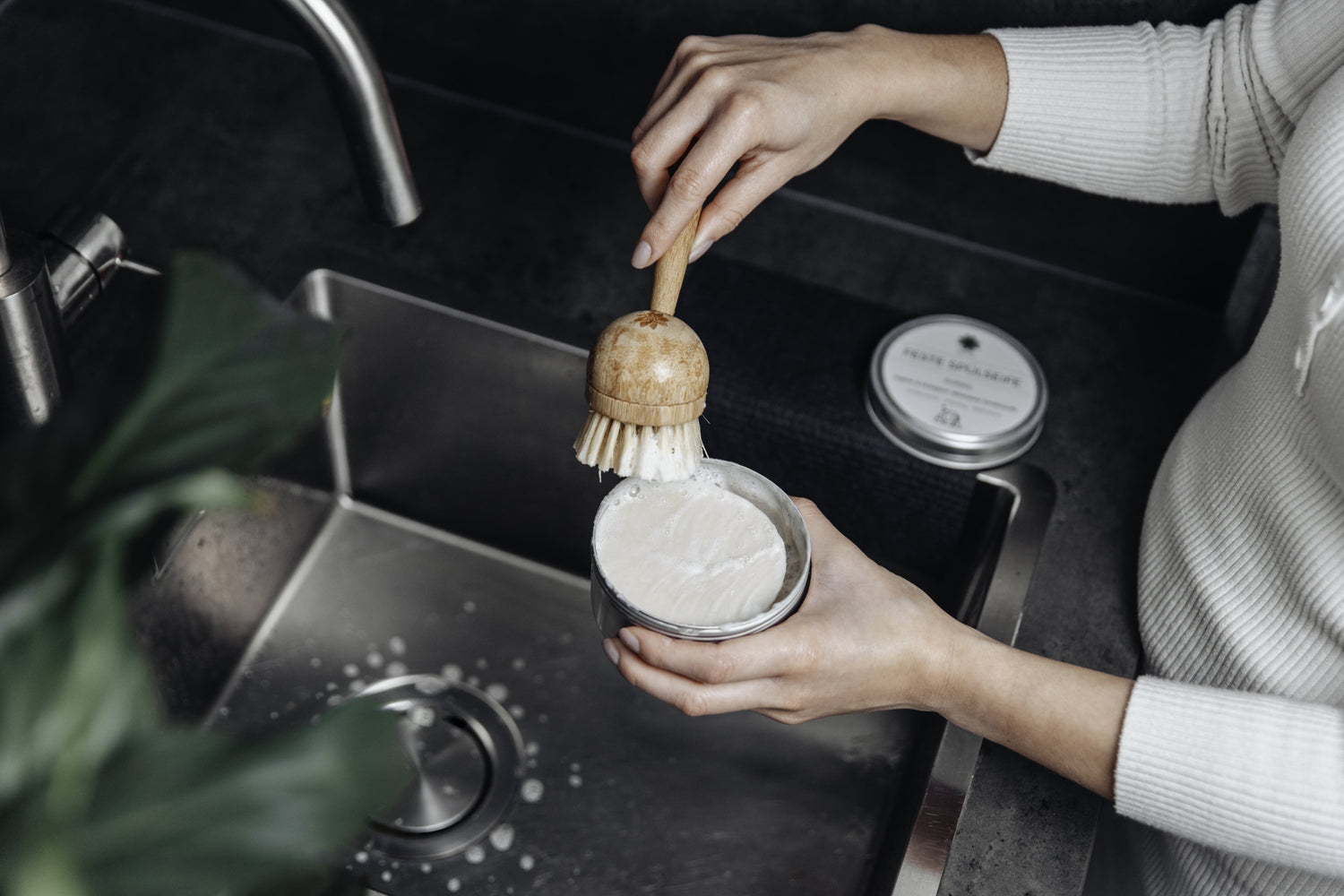 Den angefeuchteten Spülschwamm, -tuch oder -bürste mit der festen Spülseife einreiben. Das Geschirr reinigen & abspülen und sich von der Reinigungskraft selbst überzeugen.