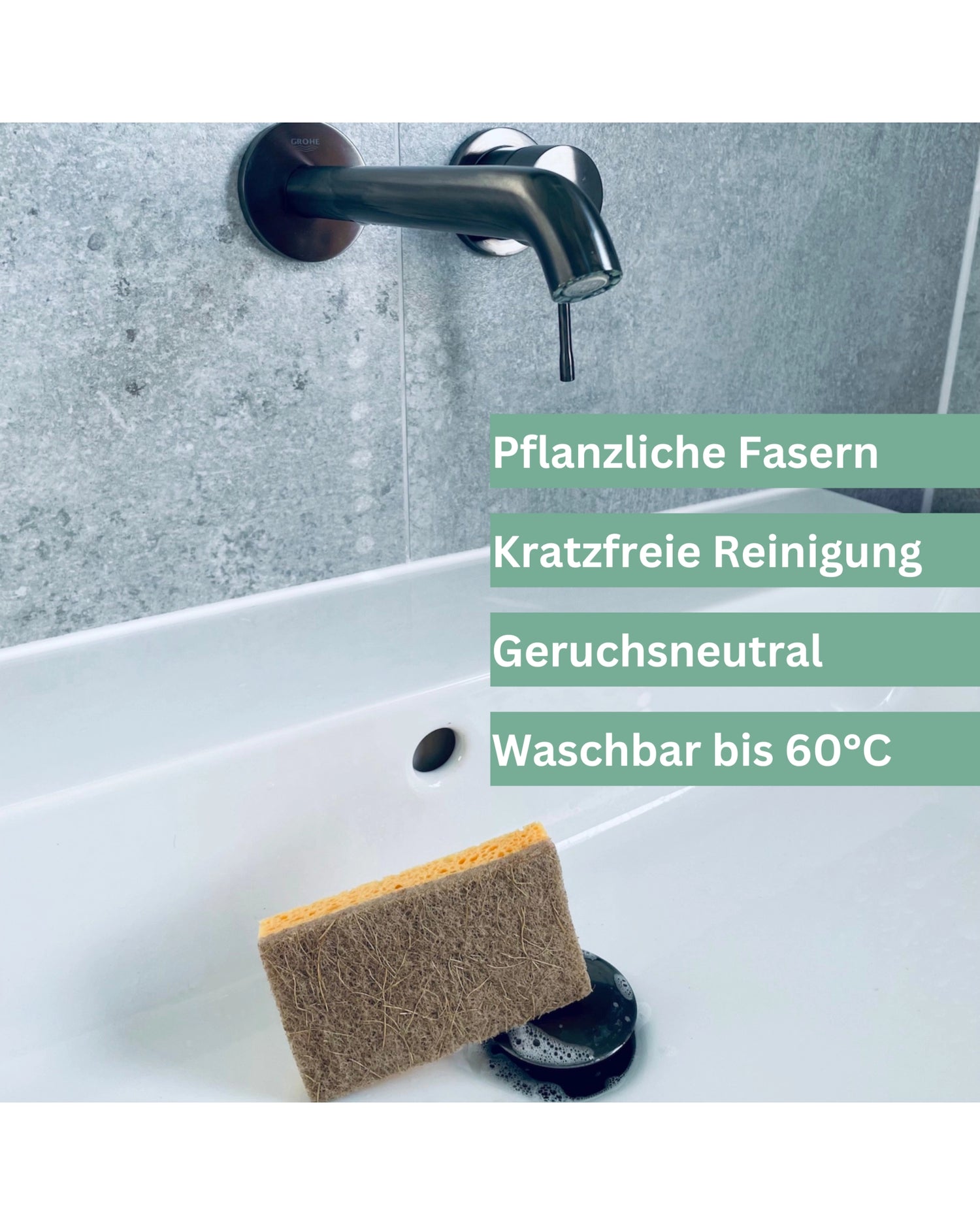 Unser Öko-Putzschwamm überzeugt durch seinen hohen Anteil an pflanzlichen Fasern, was ihn besonders ressourcenschonend macht.