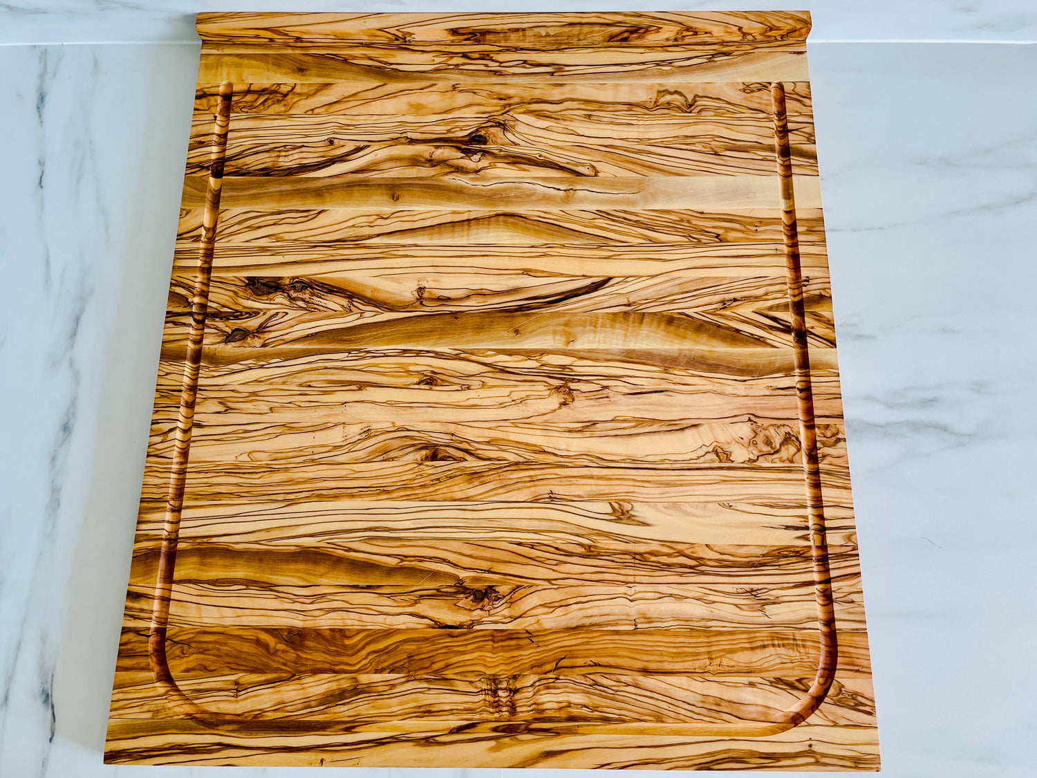 Die Saftrille auf der Rückseite des Holzbretts fängt Flüssigkeiten auf. Somit unterstützen beide Seiten des Olivenholz Schneidebretts in unterschiedlichen Verwendungszwecken.